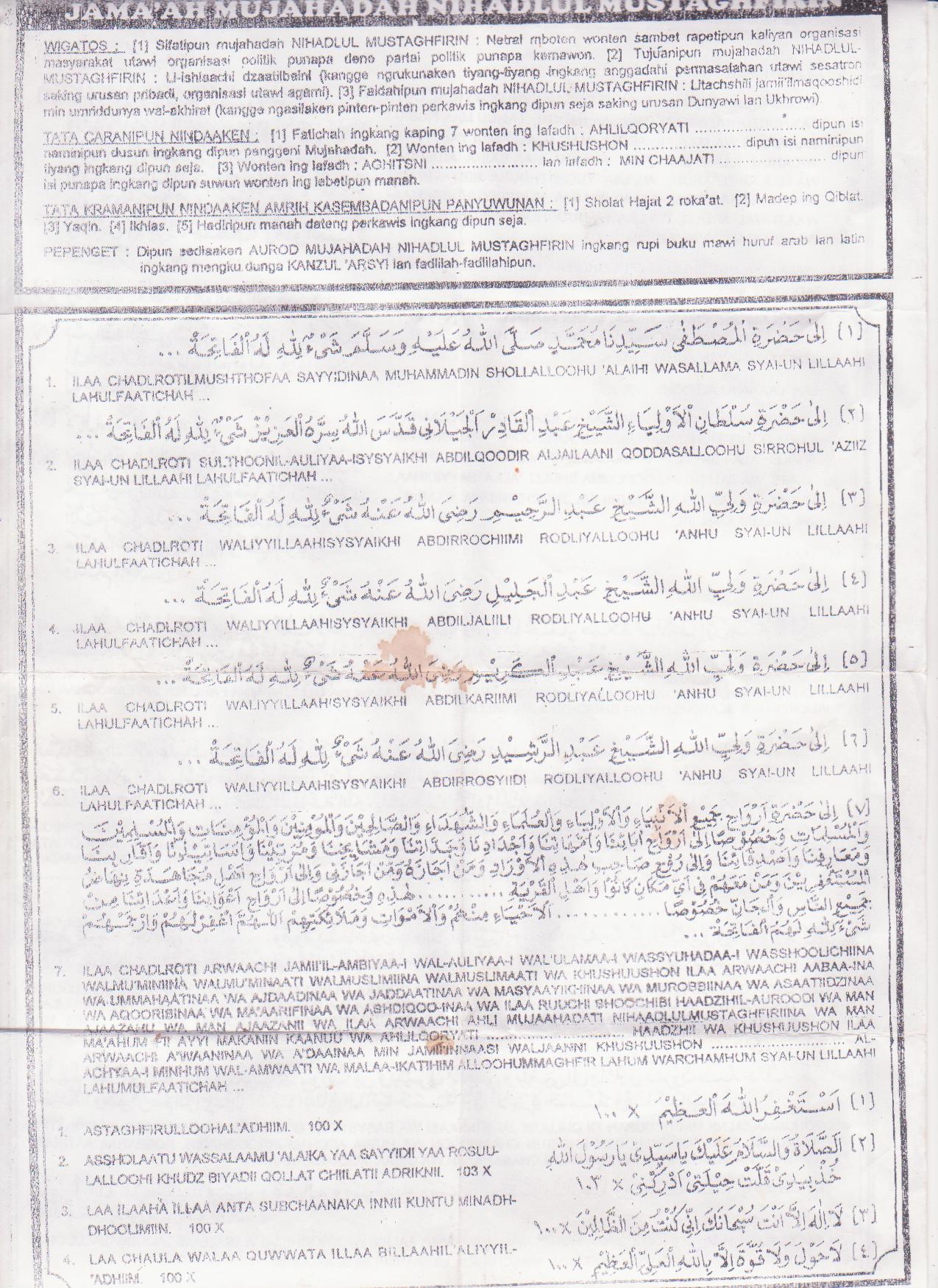 pada sore hari ketika saya bersilaturohmi ke tempat teman tidak disangka saya mendapatkan amaliyah Mujahadah Nihadlul Mustaghfirin yang menurut saya bisa untuk latihan beribadah kepada alloh swt, karena disana kita sudah di pandu dan tata cara mengamalkanya, dan sampai saat ini baru secuil lafadz yang bisa saya laksanakan yang berhubungan dengan hajjat saya yaitu sholawat, ya... terang saja saya sangat mendambakan bisa bertemu dengan junjungan saya yaitu nabi agung muhammmad SAW.